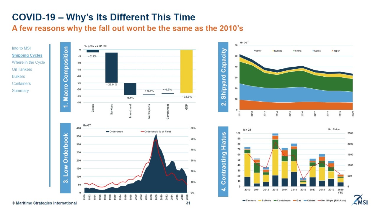 “Shipping markets have periodically had to deal with black swan events, however Covid-19 has been like bevy of black swans given its far reaching and global impact,” he said. “Naturally, many have tried to compare the recent events to those of the global financial crisis given the spread and the levels at which events have unfolded. However, from a shipping perspective I would say that they are different.” MSI does not expect Covid-19 to produce the same global long hangover as the global financial crisis did for several converging reasons. Firstly, the macro economic collapse is different this time; secondly, the shipyard capacity landscape is very different now compared with the 2000s; thirdly, today’s orderbook is a shadow of its former self; and fourthly, MSI expects contracting to remain in check.